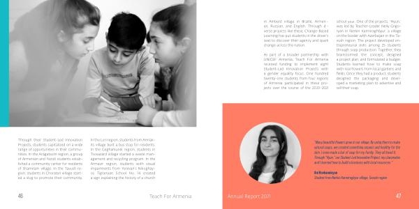 As part of a broader partnership with UNICEF Armenia , Teach For Armenia received funding to implement eight Student-Led Innovation Projects with a gender equality focus . One hundred twenty-one students from four regions of Armenia participated in these projects over the course of the 2020-2021 school year . One of the projects , “ Hyun ,” was led by Teacher-Leader Nelly Grigoryan in Nerkin Karmiraghbyur , a village on the border with Azerbaijan in the Tavush region . The project developed entrepreneurial skills among 25 students through soap production . Together , they brainstormed the concept , designed a project plan , and formulated a budget . Students learned how to make soap with real flowers from local gardens and fields . Once they had a product , students designed the packaging and developed a marketing plan to advertise and sell their soap .