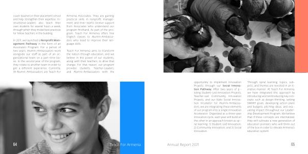 In 2021 , we launched a Nonprofit Management Pathway in the form of an Associate ’ s Program . For a period of two years , Alumni-Ambassadors work alongside our staff as part of an organizational team on a part-time basis . In the second year of the program , they rotate to another team in order to get a different experience . Currently , 39 Alumni-Ambassadors are Teach For