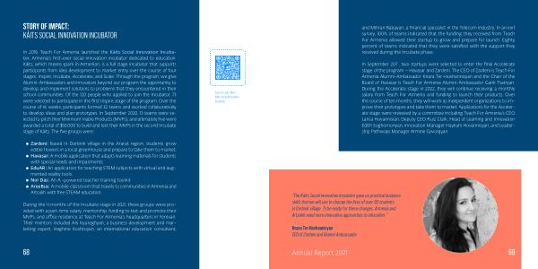 and Mihran Babayan , a financial specialist in the Telecom Industry . In an exit survey , 100 % of teams indicated that the funding they received from Teach For Armenia allowed their startup to grow and prepare for launch . Eighty percent of teams indicated that they were satisfied with the support they received during the Incubate phase .