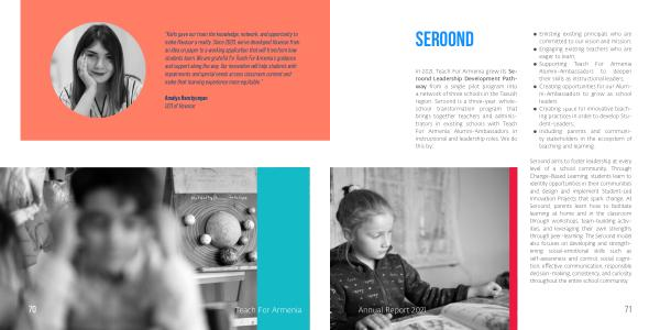 In 2021 , Teach For Armenia grew its Seroond Leadership Development Pathway from a single pilot program into a network of three schools in the Tavush region . Seroond is a three-year , wholeschool transformation program that brings together teachers and administrators in existing schools with Teach For Armenia Alumni-Ambassadors in instructional and leadership roles . We do this by :