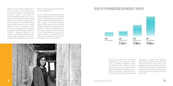 Every year , our Team aims to increase engagement on our social media platforms – Facebook , Instagram , Twitter , and YouTube . Social media is a forum where we showcase our work and engage with various stakeholders such as school communities , existing and prospective donors , and potential program participants . In 2021 , new followers across all of our platforms increased by 75 % and page visits and organic user engagement increased by 30 %. We also produced a high volume of videos that resulted in 50,000 views , a 50 % increase from last year and our highest number of viewers yet .