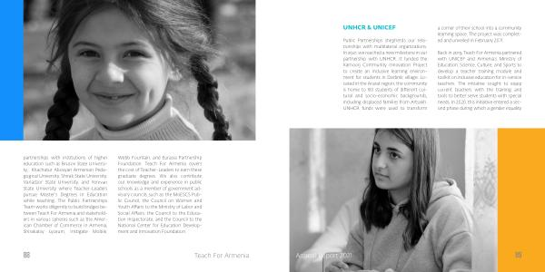partnerships with institutions of higher education such as Brusov State University , Khachatur Abovyan Armenian Pedagogical University , Shirak State University , Vanadzor State University , and Yerevan State University where Teacher-Leaders pursue Master ’ s Degrees in Education while teaching . The Public Partnerships Team works diligently to build bridges between Teach For Armenia and stakeholders in various spheres such as the American Chamber of Commerce in Armenia , Shirakatsy Lyceum , Instigate Mobile ,