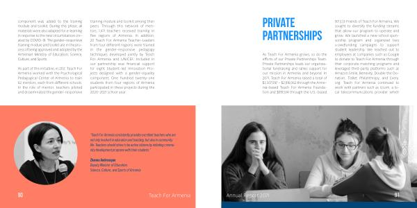 As Teach For Armenia grows , so do the efforts of our Private Partnerships Team . Private Partnerships leads our organizational fundraising and rallies support for our mission in Armenia and beyond . In 2021 , Teach For Armenia raised a total of $ 3,507,597 – $ 2,916,062 through the Armenia-based Teach For Armenia Foundation and $ 591,534 through the U . S . -based