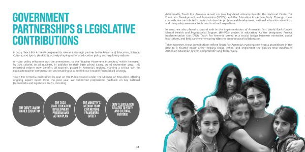 Taken together, these contributions reflect Teach For Armenia’ s evolving role from a practitioner in the field to a trusted policy actor— helping shape, refine, and implement the policies that modernize Armenia’ s education system and promote long-term equity.
