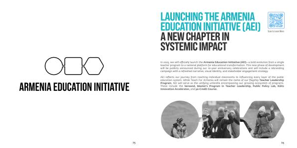 In 2025, we will officially launch the Armenia Education Initiative( AEI)— a bold evolution from a single teacher program to a national platform for educational transformation. This new phase of development will be publicly announced during our 10-year anniversary celebrations and will include a rebranding campaign with a refreshed narrative, visual identity, and stakeholder engagement strategy.