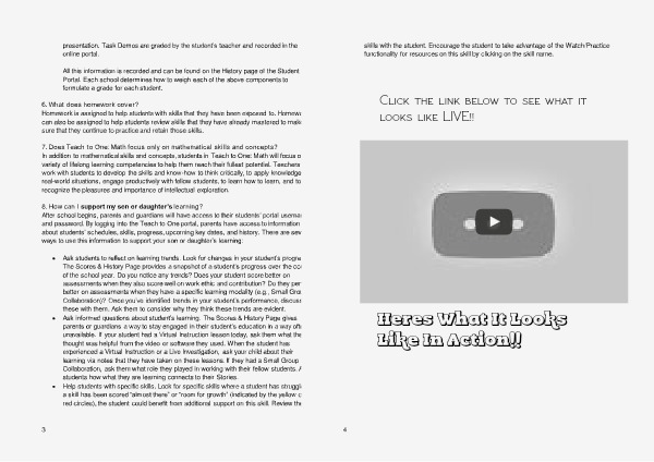 8. How can I support my son or daughter’ s learning? After school begins, parents and guardians will have access to their students’ portal username and password. By logging into the Teach to One portal, parents have access to information about students’ schedules, skills, progress, upcoming key dates, and history. There are several ways to use this information to support your son or daughter’ s learning: