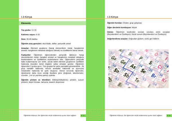 Faaliyetler : Öğretmen öğrencilerden periyodik tablonun hangi elementlerinin metal , hangileri ametal ve hangilerinin metaloid olduğunu listelemelerini ve özelliklerini söylemelerini ister . Öğrencilerin periyodik tablo kullanmasına izin verilir , ancak belirli element gruplarının özellikleri hakkında önceden temel bilgilere sahip olmaları gerekir . Öğretmen öğrencileri 3 gruba ayırır . Tüm gruplar bir şarkı yazmakla görevlendirilir - İlk grup metaller hakkında , ikincisi ametaller hakkında ve üçüncüsü metaloidler hakkında bir şarkı oluşturur . Dersin sonunda öğrenciler , öğretmenin daha önce verdiği ölçütlere göre ( doğruluk , tekerlemeler , uzunluk ...) en iyi yazılmış şarkıyı oylarlar .