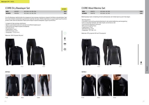 Core Dry Baselayer-sættet består af en langærmet trøje og lange underbukser velegnet til de fleste vinteraktiviteter . Sættet er lavet af blødt , kanalstrikket og funktionelt materiale , der giver effektiv fugttransport og god regulering af kropstemperatur under intensive aktiviteter . Flade sømme følger kroppens bevægelser og giver god komfort .