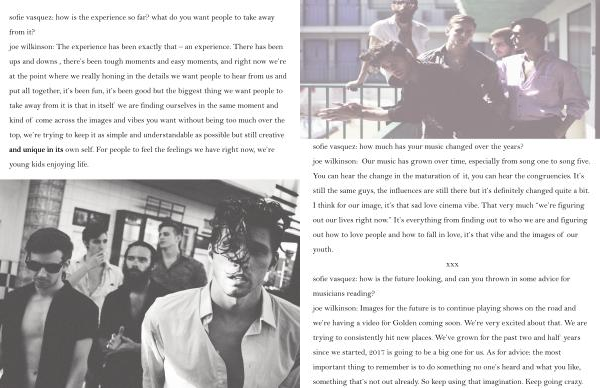 sofie vasquez: how is the experience so far? what do you want people to take away from it? joe wilkinson: The experience has been exactly that – an experience. There has been ups and downs, there’ s been tough moments and easy moments, and right now we’ re at the point where we really honing in the details we want people to hear from us and put all together, it’ s been fun, it’ s been good but the biggest thing we want people to take away from it is that in itself we are finding ourselves in the same moment and kind of come across the images and vibes you want without being too much over the top, we’ re trying to keep it as simple and understandable as possible but still creative and unique in its own self. For people to feel the feelings we have right now, we’ re young kids enjoying life.