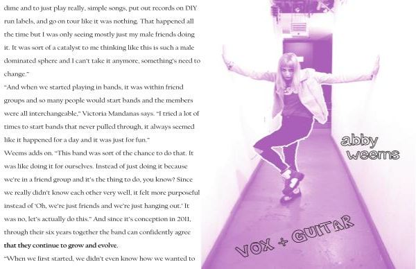 dime and to just play really, simple songs, put out records on DIY run labels, and go on tour like it was nothing. That happened all the time but I was only seeing mostly just my male friends doing it. It was sort of a catalyst to me thinking like this is such a male dominated sphere and I can’ t take it anymore, something’ s need to change.”“ And when we started playing in bands, it was within friend groups and so many people would start bands and the members were all interchangeable,” Victoria Mandanas says.“ I tried a lot of times to start bands that never pulled through, it always seemed like it happened for a day and it was just for fun.” Weems adds on.“ This band was sort of the chance to do that. It was like doing it for ourselves. Instead of just doing it because we’ re in a friend group and it’ s the thing to do, you know? Since we really didn’ t know each other very well, it felt more purposeful instead of‘ Oh, we’ re just friends and we’ re just hanging out.’ It was no, let’ s actually do this.” And since it’ s conception in 2011, through their six years together the band can confidently agree that they continue to grow and evolve.“ When we first started, we didn’ t even know how we wanted to