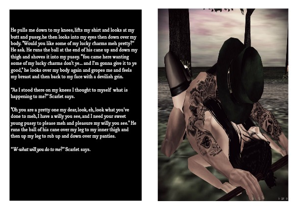 He pulls me down to my knees, lifts my shirt and looks at my butt and pussy, he then looks into my eyes then down over my body. "Would you like some of my lucky charms meh pretty?” He ask. He runs the ball at the end of his cane up and down my thigh and shoves it into my pussy. "You came here wanting some of my lucky charms don't ye... and I’m gonna give it to ye good," he looks over my body again and gropes me and feels my breast and then back to my face with a devilish grin.