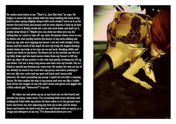 He smiles hard down at me. "That's it... Just like that,” he says. He begins to move his hips slowly with his hand holding the back of my head in place going slightly deeper with each stroke I suck on it, as he throws his head back and moans and he even shivers, I look up at him as I continue to firmly stroke his cock and suck down and hard on it, slowly deep throat it. "Maybe you can show me what you can do," telling him as I start to take off my shirt. He kneels down close to me, he kisses me and quickly moves his kisses to my neck, sliding one hand up my side and cupping my breast. I am wet with delight of his kisses and the touch of his hand all over my body. He begins kissing slowly down my body as he lays me on my back. Sending chills and makes me weak to my knees. He kisses me as he reaches my tits as I lay fully down and his hand moves down from my breast to lift my skirt up, slips off my panties to the side and gently stroking my clit up and down. I let out a deep long moan and then lose my breath. Oh, as I think to myself, my fantasy has come true. He makes his way on top of me. Slowly he inserts his cock into my pussy and starts pushing it into me. My toes curle and my eyes roll back and I moan with pleasure. He starts pounding my pussy. I squirt all over like a running faucet. He then makes his way to my pussy and eats me like a buffet. And circles his tongue on my clit and I moan and groan and giggle like a little school girl. "Yeeesssss!" I cry out.