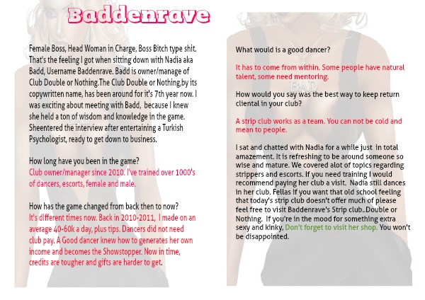 Female Boss, Head Woman in Charge, Boss Bitch type shit. That's the feeling I got when sitting down with Nadia aka Badd, Username Baddenrave. Badd is owner/manage of Club Double or Nothing.The Club Double or Nothing,by its copywritten name, has been around for it's 7th year now. I was exciting about meeting with Badd, because I knew she held a ton of wisdom and knowledge in the game.