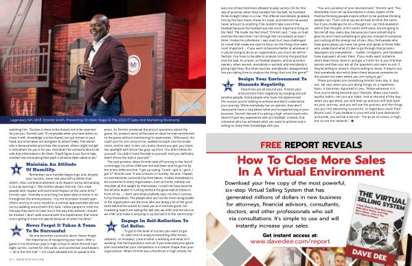 These principles are something Emmitt lives day in , day out . He says when you are doing things on a repetitive basis , it becomes ingrained in you . “ Make whatever it is that you ’ re doing become your lifestyle . Make your habits , quality habits , not just any habit . And at the end of the day , when you get done , you will look up and you will look back on your journey , and you will see the process and the things you put into becoming successful . As legendary coach Paul Bryant said , ‘ If you believe in yourself and have dedication and pride , you will be a winner .’ The price of victory is high , but so are the rewards .” n