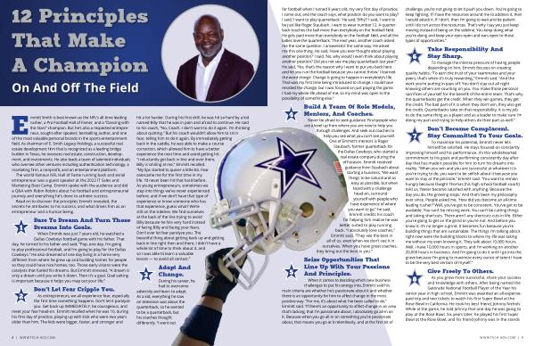 To maximize his potential , Emmitt never lets himself be satisfied . He stays focused on constantly improving himself and his performance . It ’ s this wholehearted commitment to his goals and performing consistently day after day that has made it possible for him to turn his dreams into reality . “ When you win and you are successful at whatever it is you ’ re trying to do , you want to be selfish about it because you want to stay at the pinnacle ,” Emmitt said . “ You want to remain hungry because Dwight Thomas [ his high school football coach ] told us , ‘ Never become satisfied with anything . Because the day you do , the growing stops .’ And that ’ s been my philosophy ever since . People asked me , ‘ How did you become an all-time leading rusher ?’ Well , you ’ ve got to be consistent . You ’ ve got to be available . You can ’ t be missing work . You can ’ t be cutting things and taking shortcuts . There aren ’ t any shortcuts cuts in life . Either you ’ re going to get on the grind or you ’ re not . And before you know it , it ’ s no longer a grind . It becomes fun because you ’ re building things that are sustainable . The things I ’ m talking about right now were the building blocks to where my life was taking me without my even knowing it . They talk about 10,000 hours . Well , I have 10,000 hours in sports , and I ’ m working on another 20,000 hours in business . And I ’ m going to do it until I go into the grave because I ’ m going to maximize every ounce of talent I have to be the very best version of myself .”