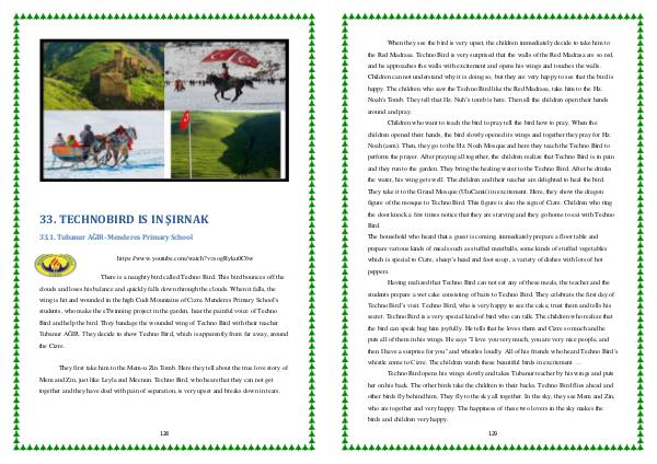 There is a naughty bird called Techno Bird. This bird bounces off the clouds and loses his balance and quickly falls down through the clouds. When it falls, the wing is hit and wounded in the high Cudi Mountains of Cizre. Menderes Primary School’ s students, who make the eTwinning project in the garden, hear the painful voice of Techno Bird and help the bird. They bandage the wounded wing of Techno Bird with their teacher Tubanur AĞIR. They decide to show Techno Bird, which is apparently from far away, around the Cizre.