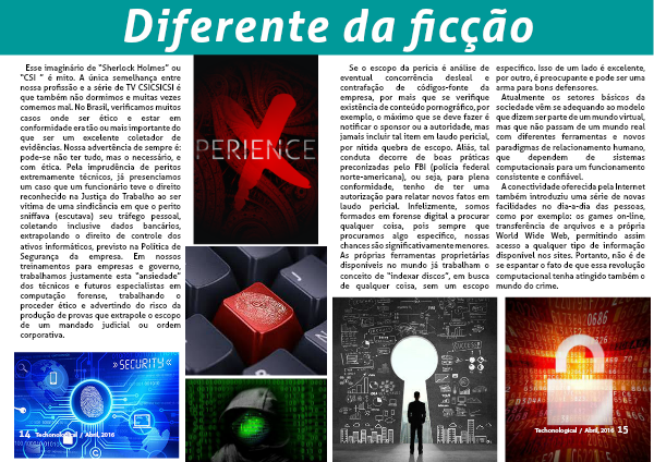 Se o escopo da perícia é análise de eventual concorrência desleal e contrafação de códigos-fonte da empresa, por mais que se verifique existência de conteúdo pornográfico, por exemplo, o máximo que se deve fazer é notificar o sponsor ou a autoridade, mas jamais incluir tal item em laudo pericial, por nítida quebra de escopo. Aliás, tal conduta decorre de boas práticas preconizadas pelo FBI (polícia federal norte-americana), ou seja, para plena conformidade, tenho de ter uma autorização para relatar novos fatos em laudo pericial. Infelizmente, somos formados em forense digital a procurar qualquer coisa, pois sempre que procuramos algo específico, nossas chances são significativamente menores. As próprias ferramentas proprietárias disponíveis no mundo já trabalham o conceito de “indexar discos”, em busca de qualquer coisa, sem um escopo específico. Isso de um lado é excelente, por outro, é preocupante e pode ser uma arma para bons defensores.