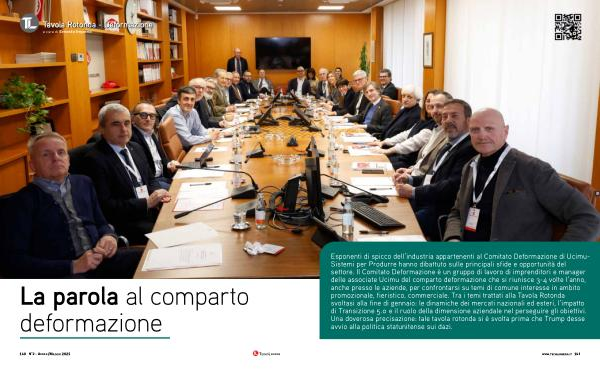 Esponenti di spicco dell’ industria appartenenti al Comitato Deformazione di Ucimu- Sistemi per Produrre hanno dibattuto sulle principali sfide e opportunità del settore. Il Comitato Deformazione è un gruppo di lavoro di imprenditori e manager delle associate Ucimu del comparto deformazione che si riunisce 3-4 volte l’ anno, anche presso le aziende, per confrontarsi su temi di comune interesse in ambito promozionale, fieristico, commerciale. Tra i temi trattati alla Tavola Rotonda svoltasi alla fine di gennaio: le dinamiche dei mercati nazionali ed esteri, l’ impatto di Transizione 5.0 e il ruolo della dimensione aziendale nel perseguire gli obiettivi. Una doverosa precisazione: tale tavola rotonda si è svolta prima che Trump desse avvio alla politica statunitense sui dazi.