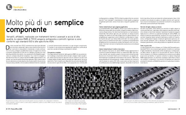 Tutto in pochi click La velocità del servizio si integra con l’ utilizzo dell’ innovativo portale B2B TECO, che consente agli operatori di definire in anticipo il taglio desiderato, impostando online lunghezza e configurazione della catena. Un approccio che permette di ridurre i tempi di fermo impianto e di ottenere esattamente la soluzione più adatta al processo produttivo. In questo contesto, le catene industriali RMB rappresentano un elemento strategico dell’ offerta TECO: non semplici componenti, ma soluzioni progettate per garantire prestazioni elevate e affidabilità operativa in qualunque condizione di lavoro.