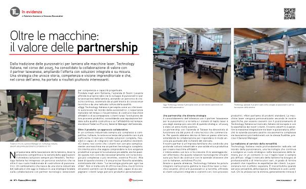 La tradizione al servizio della versatilità Technology Italiana resta profondamente radicata nel mondo della punzonatura, una tecnologia che continua a svolgere un ruolo strategico nella lavorazione della lamiera, pur in un contesto in cui il taglio laser è sempre più diffuso. « Oggi il mercato della lamiera ha bisogno di professionalità e di interlocutori seri, in grado di fornire prodotti che rispettino le aspettative dei clienti. La punzonatura non è affatto superata. È insostituibile quando servono versatilità, deformazioni, filettature e costi contenuti. Chi la utilizza non la elimina, generalmente rinnova il