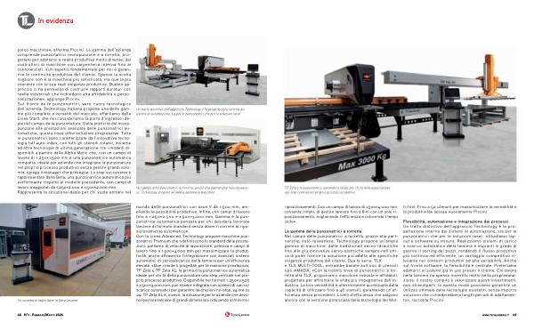 parco macchine », afferma Piccini. La gamma dell’ azienda comprende punzonatrici monopunzone e a torretta, progettate per adattarsi a realtà produttive molto diverse, dai costruttori di macchine con carpenteria interna fino ai contoterzisti. « Un aspetto fondamentale per noi è garantire la continuità produttiva del cliente. Spesso la scelta migliore non è la macchina più sofisticata, ma quella più coerente con le sue reali esigenze produttive. Questo approccio ci ha permesso di costruire rapporti duraturi con realtà industriali che richiedono alta affidabilità e personalizzazione », aggiunge Piccini. Sul fronte delle punzonatrici, vero cuore tecnologico dell’ azienda, Technology Italiana propone una delle gamme più complete e versatili del mercato. « Partiamo dalla Linea Start, che noi consideriamo la porta d’ ingresso ideale nel campo della punzonatura. Dalla praticità del monopunzone alle prestazioni avanzate delle punzonatrici automatiche, questa linea offre soluzioni progressive. Tutte le punzonatrici sono caratterizzate dall’ innovativa tecnologia full auto-index, con tutti gli utensili rotanti, insieme ad altre tecnologie di ultima generazione. tre i modelli disponibili a partire dalla Alpha Matic che, con un campo di lavoro di 1.250 × 1.500 mm è una punzonatrice automatica compatta, ideale per aziende che integrano la punzonatura nel proprio processo produttivo senza gestire grandi volumi », spiega il manager che prosegue: Lo step successivo è rappresentato dalla Beta, una punzonatrice automatica più performante rispetto al modello precedente, con campi di lavoro maggiorati da 1.250 × 2.000 e 1.500 × 2.000 mm. Rappresenta la soluzione ideale per chi vuole entrare nel