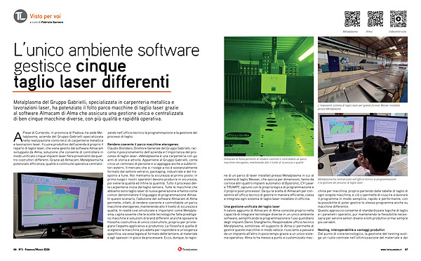 Pieve di Curtarolo, in provincia di Padova, ha sede Metalplasma, azienda del Gruppo Gabrielli specializzata nella realizzazione conto terzi di carpenteria metallica e lavorazioni laser. Il cuore produttivo dell’ azienda è proprio il reparto di taglio laser, che viene gestito dal software Almacam sviluppato da Alma, soluzione che consente di controllare in modo unificato cinque impianti laser fibra provenienti da quattro costruttori differenti. Grazie ad Almacam, Metalplasma ha potenziato efficienza, qualità e continuità operativa centraliz- zando nell’ ufficio tecnico la programmazione e la gestione dei processi di taglio.