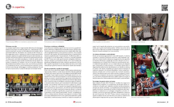 Un sistema ottimizzato e automatizzato Anche se la pressa rappresenta il cuore dell’ impianto, il sistema completo è composto da diverse macchine, tutte progettate e gestite con lo stesso livello di attenzione ingegneristica, per garantire la massima efficienza e qualità del processo. Nel percorso di coprogettazione con il cliente, I. M. V. Presse ha coinvolto partner storici e altamente specializzati, con cui collabora da anni, per integrare ogni componente in modo sinergico. Un esempio significativo è rappresentato dalla linea di alimentazione coil, dotata di sistema di cambio rulli rapido, progettata per gestire diverse tipologie di materiali e spessori con estrema flessibilità. L’ intero cambio produzione richiede solo 15 minuti, gestito da un singolo operatore, mentre l’ introduzione del nuovo nastro avviene in appena 2 minuti. Il risultato è un impianto che incarna i principi della Smart Factory, con una Overall Equipment Efficiency( OEE) superiore al 95 %, a testimonianza di un sistema altamente ottimizzato e automatizzato.