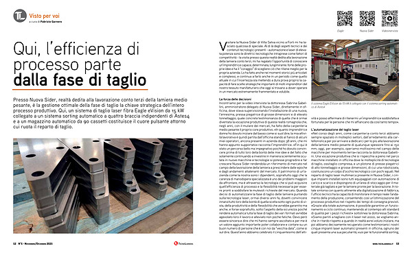 L’ automatizzazione del taglio laser « Nel corso degli anni, come carpenteria conto terzi abbiamo sempre spaziato in molteplici settori, dall’ arredamento alla cartellonistica per poi arrivare a dedicarci per lo più alla lavorazione della lamiera medio pesante di qualunque spessore fino ai 150 mm; oggi, per esempio, operiamo moltissimo nel campo delle macchine per movimento terra » racconta la dottoressa Gabellini. Una vocazione produttiva che si rispecchia a pieno nel parco macchine installato in officina dove la molteplicità di tecnologie di taglio, ossitaglio compresa, e un plotone di presse piegatrici di alto tonnellaggio e grosse dimensioni, di cui una robotizzata, costituiscono un colpo d’ occhio tecnologico con pochi eguali. Nel reparto di taglio laser multimarca presente in Nuova Sider, i cinque impianti installati sono tutti equipaggiati con automazione di carico e scarico e dispongono di un’ area di stoccaggio per il materiale già tagliato e per le lamiere pronte per la lavorazione. In totale sintonia con quanto attinente alla digitalizzazione di fabbrica, l’ ufficio tecnico ha la capacità di monitorare in tempo reale l’ andamento della produzione, consentendo così un’ ottimizzazione del processo produttivo nel rispetto dei tempi di consegna previsti. « Grazie alla totale automazione, è possibile garantire un funzionamento a ciclo continuo, mantenendo al contempo alti standard di qualità per i pezzi richiesti » sottolinea la dottoressa Sabrina. « Siamo partiti a tagliare con il laser nel 2000, se vogliamo anche in ritardo rispetto a quando in realtà avrei voluto iniziare, ma poi abbiamo decisamente recuperato come testimoniano i nostri cinque impianti laser automatici presenti in officina, ognuno dei quali presenta una sua peculiarità, vuoi per le funzionalità sorting,