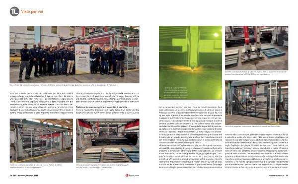mm e capacità di taglio in gas mix fino a 25 mm di spessore che è stato collegato a un sistema sorting automatico di carico e scarico Astes4 a quattro braccia indipendenti con portata di 400 kg, 100 kg per ogni braccio, a sua volta interfacciato con un imponente magazzino automatico Tekmag esterno( ma coperto) con 90 cassetti da 50 q l’ uno che permette di immagazzinare ampie scorte di lamiera, protette dalle intemperie, al fine di fare fronte alle esigenze della clientela in tempi brevi. L’ immediata disponibilità permessa dalle scorte permette una considerevole compressione di tempi necessari a produrre quanto richiesto. La zona magazzino prodotto finito garantisce la possibilità di immagazzinare grandi quantità di materiale arrivando a contenere anche interi macchinari pronti per il montaggio finale, la sua suddivisione in zone permette di ridurre considerevolmente i tempi di carico. « Il sistema eVision di Eagle è stato scelta perché in quel momento per qualità e prestazioni di taglio era la macchina più performante presente sul mercato » afferma la dottoressa Gabellini. La eVision è una macchina, come tutte quelle di Eagle, progettata per“ correre” e fornire risultati ottimali 24 ore su 24, 7 giorni su 7, sia che si tratti di lotti piccoli o grandi, di lamiere sottili o spesse. Scelte costruttive importanti come l’ uso di motori lineari su tutti gli assi, la struttura della macchina realizzata in granito sintetico, l’ impiego della testa di taglio brevettata eVa che richiede una manutenzione