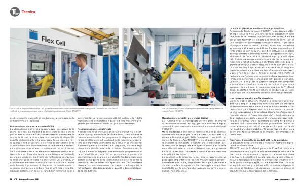 Automazione, sicurezza e sostenibilità L’ automazione non è più appannaggio esclusivo delle grandi aziende. La TruBend 3000 è stata pensata anche per le medie-piccole PMI che desiderano aumentare la produttività senza rinunciare alla semplicità d’ uso. Un aspetto determinante è la sicurezza, tema cruciale nelle operazioni di piegatura: il sistema di protezione Bend Guard utilizza una combinazione di telecamere e sensori a matrice per monitorare costantemente l’ area di lavoro. Se il software rileva un elemento estraneo nell’ area di lavoro, la macchina si arresta immediatamente, evitando potenziali incidenti. Sul fronte dell’ efficienza energetica, la TruBend 3000 integra il Servo Drive On-Demand, un azionamento elettrico a velocità controllata che si attiva solo durante il processo di piegatura. In questo modo, il consumo energetico si riduce fino al 30 % rispetto ai tradizionali sistemi, con benefici tangibili in termini di costi e sostenibilità. La minore rumorosità del motore e la ridotta manutenzione completano il quadro di una macchina progettata per lavorare in modo più pulito e silenzioso.