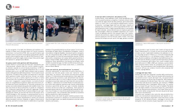 , ma quest’ ultimo ha ancora senso con alcuni tipi di materiali. « Ricordiamoci che la lunghezza d’ onda del laser fibra non viene letta o viene letta male da alcuni materiali, per esempio il PMMA( polimetilmetacrilato o plexiglas). Motivo per cui usiamo ancora il laser CO 2 per l’ acrilico o per le fustelle. Parlando però del taglio metalli, le macchine laser CO 2 sottostanno a costi di manutenzione altissimi, che il laser fibra non ha. Ma i motivi della conquista del mercato da parte del laser fibra sono innumerevoli. Consente per esempio alte velocità, alta produttività e quasi non necessita di manutenzione: per questo si riescono a dare garanzie importanti sulla macchina e sulla sorgente. E non dimentichiamo i vantaggi in termini sia energetici che di consumo di gas inquinanti, con un impat-
