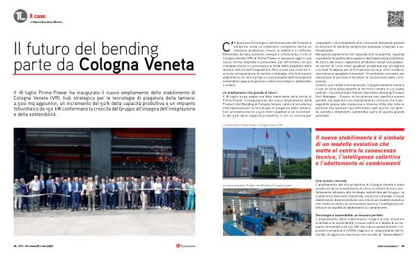 Un ampliamento che guarda al futuro Il 18 luglio 2025 segna una data importante nella storia di Prima Power: l’ inaugurazione del nuovo ampliamento della Product Unit Bending di Cologna Veneta, centro di eccellenza internazionale per le tecnologie di piegatura della lamiera. Con un’ estensione di 2.500 metri quadrati e un incremento del 50 % della capacità produttiva, il sito si rinnova per rispondere concretamente alla crescente domanda globale di soluzioni di bending sempre più avanzate, integrate e automatizzate. Ma questa espansione non riguarda solo la quantità, riguarda soprattutto la qualità dello spazio e dell’ esperienza produttiva. Al fianco del nuovo capannone produttivo sorge una palazzina servizi di 1.000 metri quadrati, progettata per accogliere una Sala Academy per la formazione tecnica, uffici moderni, una mensa e spogliatoi funzionali. Un ambiente concepito per valorizzare le persone e facilitare la condivisione della conoscenza. « Siamo una realtà internazionale, orgogliosamente italiana e con un forte attaccamento al territorio veneto in cui siamo radicati- ha sottolineato Stefano Gecchele, Bending Product Unit Manager- Essere un’ eccellenza non significa essere perfetti, ma aspirare a un miglioramento continuo che è perseguibile grazie alle numerose e diverse sfide che tutte le persone che lavorano qui affrontano ogni giorno con grande serietà e dinamismo sentendosi parte di questa grande azienda ».