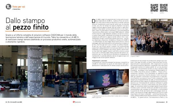 Digitalizzare i processi La filosofia di crescita graduale ha dunque consentito a LA. ME. S. di diventare un punto di riferimento nella progettazione e realizzazione di stampi grazie anche all’ introduzione di tecnologie di produzione sempre più evolute e che oggi formano un parco macchine ben fornito, diversificato e automatizzato. « Per migliorare la nostra efficienza produttiva abbiamo completato due macchine integrando sistemi di cambio pallet, di cui uno da dieci pallet che ci ha permesso di fare un vero e proprio salto di qualità- prosegue Luca Carpanese, Responsabile ufficio CAM e macchine presso LA. ME. S.- Grazie all’ automazione, durante i turni presidiati un operatore può seguire più macchine, mentre durante i turni non presidiati gli impianti continuano la produzione e l’ operatore al mattino successivo trova il lotto completo ». Come sempre più frequentemente accade, all’ automatizzazione delle attività ha fatto seguito la digitalizzazione della produzione con l’ introduzione di soluzioni software in grado di semplificare, snellire e velocizzare una serie di passaggi. « L’ evoluzione delle tecnologie digitali ha permesso di tenere sotto controllo molte più variabili di processo, consentendoci per esempio di analizzare e minimizzare la quantità di sfrido derivante dallo stampaggio delle lamiere, che al giorno d’ oggi rappresenta una voce di costo importante nei bilanci aziendali- sottolinea Alessia Giacomin, Responsabile Area Amministrativa e Personale di LA. ME. S.- In quest’ ottica, l’ introduzione di Tebis ci ha