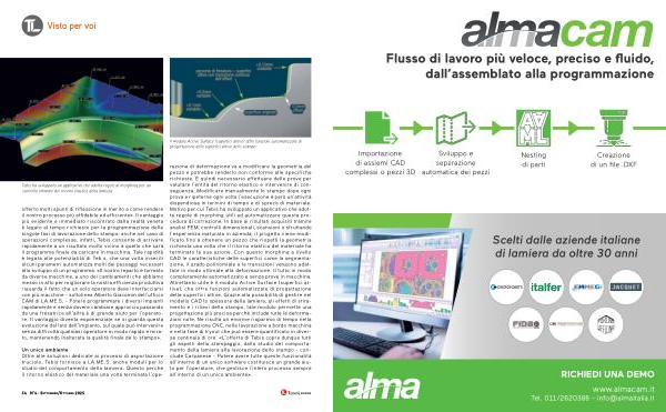 Un unico ambiente Oltre alle soluzioni dedicate ai processi di asportazione truciolo, Tebis fornisce a LA. ME. S. anche moduli per lo studio del comportamento della lamiera. Questo perché il ritorno elastico del materiale una volta terminata l’ operazione di deformazione va a modificare la geometria del pezzo e potrebbe renderlo non conforme alle specifiche richieste. È quindi necessario effettuare delle prove per valutare l’ entità del ritorno elastico e intervenire di conseguenza. Modificare manualmente lo stampo dopo ogni prova e ripeterne ogni volta l’ esecuzione è però un’ attività dispendiosa in termini di tempo e di spreco di materiale. Motivo per cui Tebis ha sviluppato un applicativo che adotta regole di morphing utili ad automatizzare questa procedura di correzione. In base ai risultati acquisiti tramite analisi FEM, controlli dimensionali, scansioni o sfruttando l’ esperienza maturata in azienda, il progetto viene modificato fino a ottenere un pezzo che rispetti la geometria richiesta una volta che il ritorno elastico del materiale ha terminato la sua azione. Con questo morphing a livello CAD le caratteristiche delle superfici come la segmentazione, il grado polinomiale e le transizioni vengono adattate in modo ottimale alla deformazione. Il tutto in modo completamente automatizzato e senza prove in macchina. Altrettanto utile è il modulo Active Surface( superfici attive), che offre funzioni automatizzate di progettazione delle superfici attive. Grazie alla possibilità di gestire nel modello CAD lo spessore della lamiera, gli effetti di stiramento e i rilievi dello stampo, tale modulo permette una progettazione più precisa perché include tutte le deformazioni note. Ne risulta un enorme risparmio di tempo nella programmazione CNC, nella lavorazione a bordo macchina e nella fase di tryout che può essere quantificato in diverse centinaia di ore. « L’ offerta di Tebis copre dunque tutti gli aspetti dello stampaggio, dallo studio del comportamento della lamiera alla lavorazione dello stampo- conclude Carpanese- Potere avere tutte queste funzionalità all’ interno di un unico software costituisce un grande aiuto per l’ operatore, che gestisce l’ intero processo sempre all’ interno di un unico ambiente ».