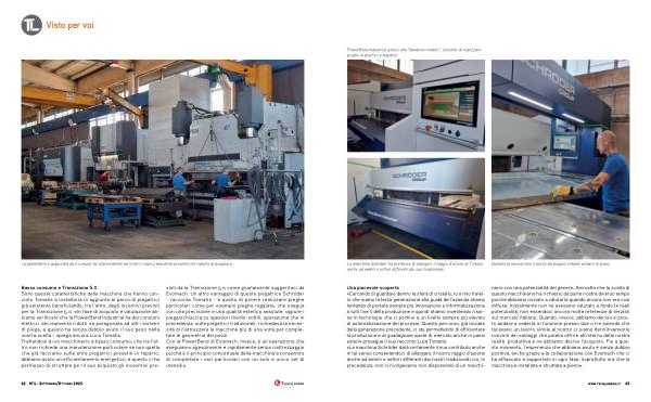 Una piacevole scoperta « Cercando di guardare dentro la sfera di cristallo, io e mio fratello che siamo la terza generazione alla guida dell’ azienda stiamo tentando di portare sempre più innovazione e informatizzazione a tutti livelli della produzione e quindi stiamo investendo risorse in tecnologie che ci portino a un livello sempre più elevato di automatizzazione dei processi. Questo percorso, già iniziato dalla generazione precedente, ci sta permettendo di efficientare la produzione e di guadagnare quote di mercato anche in paesi esteri » prosegue il suo racconto Luca Tomatis. « La macchina Schröder darà certamente il suo contributo anche in tal senso consentendoci di allargare il nostro raggio d’ azione anche ad ambiti e settori differenti dai nostri tradizionali cui, in precedenza, non ci rivolgevamo non disponendo di un macchinario con una potenzialità del genere. Ammetto che la scelta di questo macchinario ha richiesto da parte nostra diverso tempo poiché abbiamo iniziato a valutarla quando ancora non era così diffusa. Inizialmente non ne avevamo valutato a fondo le reali potenzialità, non essendoci ancora molte referenze di terzisti sul mercato italiano. Quando, invece, abbiamo deciso e potuto andare a vederla in funzione presso due o tre aziende che facevano un lavoro simile al nostro ci siamo definitivamente convinti dei vantaggi che poteva offrire all’ interno della nostra realtà produttiva e ne abbiamo deciso l’ acquisto. Fio a questo momento, l’ esperienza che abbiamo avuto è senza dubbio positiva, anche grazie alla collaborazione con Evomach che ci ha affiancato e supportato in ogni fase, soprattutto ora che la macchina è installata e sfruttata a pieno ».
