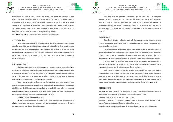 Para a demonstração, utilizamos garrafas plásticas com solo comum, onde cultivamos sementes de milho transgênico e convencional. A semeadura foi realizada no dia 28 de maio de 2018, e a emergência no dia 6 de junho de 2018. As cultivares passaram pelas mesmas condições climáticas e sofreram irrigação a cada dois dias. A aplicação do herbicida Glifosato foi realizada no dia 21 de junho de 2018. RESULTADOS ENCONTRADOS Avaliando os efeitos deste herbicida sobre a parte aérea afetada, constatamos: as plantas transgênicas continuaram seu desenvolvimento, enquanto o crescimento da planta convencional foi retardado e ela está morrendo.