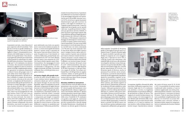 La testa tiltante azionata da motore torque tunamente nervata, come dimostra il peso superiore alle 20 tonnellate. Tutti gli assi scorrono su guide rettificate accoppiate a pattini a ricircolo di rulli di taglia 55. L’ asse Y, che permette lo scorrimento del RAM lungo la traversa, è dotato di tre guide lineari. Una soluzione progettuale adottata per aumentare ulteriormente la robustezza e la stabilità dell’ intera struttura. Il movimento degli assi Y e Z è realizzato con sistema a crociera, che consente di mantenere elevata la rigidità di tutta la struttura anche con RAM completamente esteso. Per garantire la massima dinamicità e ridurre l’ usura del gruppo asse Z, il peso della testa viene bilanciato con due cilindri pneumatici. All’ asse X, infine, è affidato il compito di movimentare la tavola collocata al di sotto del portale. La larghezza del basamento e la posizione delle guide permettono di lavorare in totale appoggio e consentono al piano di lavoro di non flettere alle estremità della corsa. L’ asse X può essere da 1.700 mm, 2.200 mm o 2.700 mm, l’ asse Y ha una lunghezza di 2.100 mm mentre l’ asse Z ha una corsa di 900 mm con testa orizzontale o 700 mm con testa verticale. Sui centri di lavoro serie CLP configurati con cinque assi, il quarto e il quinto asse possono essere ottenuti integrando una testa birotativa, una testa con quarto asse e una tavola incassata nel piano oppure adottando una testa con quarto asse e una tavola rialzata sul piano di lavoro. La testa monospalla birotativa( quarto e quinto asse) è azionata da due motori sincroni Direct Drive( torque) che gestiscono il movimento in continuo della testa, permettendo una inclinazione di ± 110 ° con l’ asse tiltante( quarto asse) e una rotazione di ± 270 ° con l’ asse rotativo( quinto asse). L’ elettromandrino che equipaggia la testa consente di ottenere 50 kW di potenza nominale a 5.300 giri / min, con una coppia nominale di 90 Nm. Può essere utilizzato fino a 18.000 giri / min in regime continuo.
