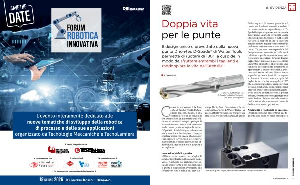Creare innovazione è la filosofia di Walter Tools. L’ utensiliere tedesco, infatti, è alla costante ricerca di soluzioni che permettano di incrementare l’ efficienza di processo in ogni tipologia di lavorazione meccanica. Ne è un esempio la nuova punta a cuspide Drion · tec D-Spade ®, che si distingue sul mercato per la cuspide a due taglienti. Una geometria pressoché unica, studiata per raddoppiare la vita utile dell’ inserto mantenendo le stesse prestazioni e affidabilità di una tradizionale cuspide a un tagliente.