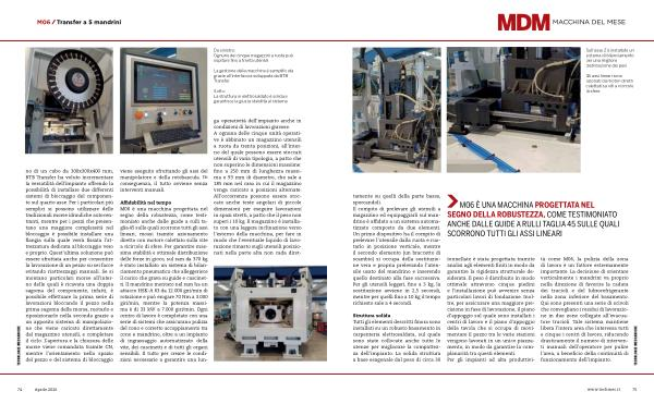 Affidabilità nel tempo M06 è una macchina progettata nel segno della robustezza, come testimoniato anche dalle guide a rulli taglia 45 sulle quali scorrono tutti gli assi lineari, mossi tramite azionamento diretto con motore calettato sulla vite a ricircolo di sfere. Per garantire massima stabilità e ottimale distribuzione delle forze in gioco, sul ram da 370 kg è stato installato un sistema di bilanciamento pneumatico che alleggerisce il carico che grava su guide e cuscinetti. Il mandrino montato nel ram ha un attacco HSK-A 63 da 12.000 giri / min di rotazione e può erogare 70 Nm a 3.000 giri / min, mentre la potenza massima è di 33 kW a 7.000 giri / min. Ogni centro di lavoro è completato con una serie di sistemi che assicurano pulizia del cono e corretto accoppiamento tra cono e mandrino, oltre a un impianto di ingrassaggio automatizzato della vite, dei cuscinetti e di tutti gli organi sensibili. Il tutto per creare le condizioni necessarie a garantire una lun- ga operatività dell’ impianto anche in condizioni di lavorazioni gravose. A ognuna delle cinque unità operative è abbinato un magazzino utensili a ruota da trenta posizioni, all’ interno del quale possono essere stoccati utensili di varia tipologia, a patto che non superino le dimensioni massime: fino a 250 mm di lunghezza massima e 93 mm di diametro, che sale a 185 mm nel caso in cui il magazzino venga caricato a posizioni alternate. All’ occorrenza possono essere stoccate anche teste angolari di piccole dimensioni per eseguire lavorazioni in spazi stretti, a patto che il peso non superi i 10 kg. Il magazzino è installato con una leggera inclinazione verso l’ esterno della macchina, per fare in modo che l’ eventuale liquido di lavorazione rimasto sugli utensili posizionati nella parte alta non cada diret-
