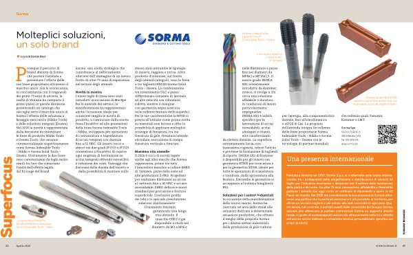 Fondata a Venezia nel 1950, Sorma S. p. a. si è affermata sulla scena internazionale tra i protagonisti della progettazione e distribuzione di utensili da taglio per l’ industria meccanica e abrasione per il settore della lavorazione della pietra e del vetro. Da oltre 75 anni, innovazione, affidabilità e flessibilità guidano l’ azienda che oggi conta un centinaio di dipendenti e opera in 60 Paesi nel mondo. Dal 2016 sta consolidando la sua presenza in Europa attraverso una politica che la porta ad avvicinarsi il più possibile al territorio, per offrire un servizio migliore e più mirato alle reali necessità di ogni area. Questo lavoro, nel concreto, è portato avanti dalle consociate del Gruppo Sorma, aziende che affiancano ai partner commerciali Sorma un supporto diretto locale, in grado di accompagnarli ancora più efficacemente nelle loro attività attraverso servizi dedicati e consulenza tecnica personalizzata specifica sui propri prodotti. www. techmec. it 85