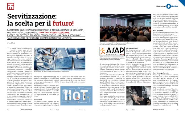IL 20 MARZO 2025 TECNOLOGIE MECCANICHE IN COLLABORAZIONE CON ASAP ORGANIZZA UN CONVEGNO SUL TEMA DELLA SERVITIZZAZIONE . ESPERTI DEL SETTORE , RELAZIONI TECNOLOGICHE , UNA TAVOLA ROTONDA E TANTI MOMENTI DI NETWORKING CARATTERIZZERANNO L ’ EVENTO .