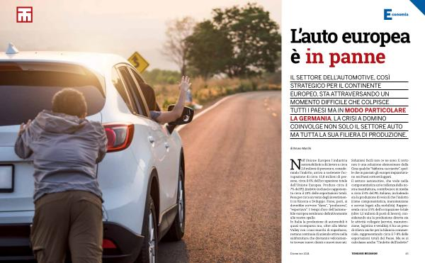 Nell ’ Unione Europea l ’ industria automobilistica dà lavoro a circa 2,6 milioni di persone e , considerando l ’ indotto , arriva a sostenere l ’ occupazione di circa 13,8 milioni di persone , circa il 6 % dell ’ occupazione totale dell ’ Unione Europea . Produce circa il 7 % del PIL ( indotto incluso ) e rappresenta circa il 20 % delle esportazioni totali . Pesa per circa un terzo degli investimenti in Ricerca e Sviluppo . Forse , però , si dovrebbe scrivere “ dava ”, “ produceva ”, “ esportava ”. I tempi d ’ oro dell ’ automobile europea sembrano definitivamente alle nostre spalle . In Italia la produzione di automobili è quasi scomparsa ma , oltre alla Motor Valley con i suoi marchi di superlusso , restano centinaia di aziende attive nella subfornitura che dovranno velocemente trovare nuovi clienti e nuovi mercati .