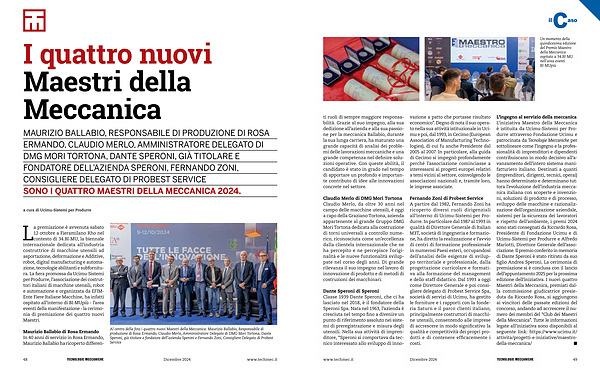L ’ ingegno al servizio della meccanica L ’ iniziativa Maestro della Meccanica è istituita da Ucimu-Sistemi per Produrre attraverso Fondazione Ucimu e patrocinata da Tecnologie Meccaniche per sottolineare come l ’ ingegno e la professionalità di imprenditori e dipendenti contribuiscano in modo decisivo all ’ a- vanzamento dell ’ intero sistema manifatturiero italiano . Destinati a quanti ( imprenditori , dirigenti , tecnici , operai ) hanno determinato e determinano tuttora l ’ evoluzione dell ’ industria meccanica italiana con scoperte e invenzioni , soluzioni di prodotto e di processo , sviluppo delle macchine e razionalizzazione dell ’ organizzazione aziendale , sistemi per la sicurezza dei lavoratori e rispetto dell ’ ambiente , i premi 2024 sono stati consegnati da Riccardo Rosa , Presidente di Fondazione Ucimu e di Ucimu-Sistemi per Produrre e Alfredo Mariotti , Direttore Generale dell ’ associazione . Il premio conferito in memoria di Dante Speroni è stato ritirato da suo figlio Andrea Speroni . La cerimonia di premiazione si è conclusa con il lancio dell ’ appuntamento 2025 per la prossima edizione dell ’ iniziativa . I nuovi quattro Maestri della Meccanica , premiati dalla commissione giudicatrice presieduta da Riccardo Rosa , si aggiungono ai vincitori delle passate edizioni del concorso , andando ad accrescere il numero dei membri del “ Club dei Maestri della Meccanica ”. Tutte le informazioni legate all ’ iniziativa sono disponibili al seguente link : https :// www . ucimu . it / attivita / progetti-e-iniziative / maestrodella-meccanica / www . techmec . it Dicembre 2024 49