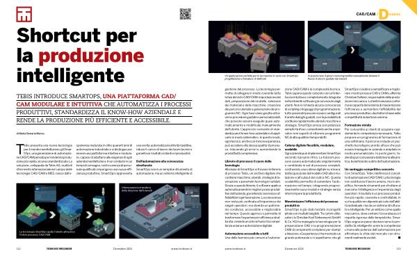 Un vantaggio competitivo concreto Con SmartOps, Tebis ridefinisce il concetto di automazione CAD / CAM. La tecnologia non sostituisce il lavoro umano, ma lo amplifica, fornendo strumenti per sfruttare al massimo l’ intelligenza e l’ esperienza degli operatori. Il risultato è un processo produttivo più rapido, coerente e controllabile, in cui la qualità non dipende più solo dall’ abilità individuale, ma da un sistema strutturato e intelligente. Per un settore come quello meccanico, dove contano l’ accuratezza e il rispetto rigoroso delle tempistiche, SmartOps segna un passo decisivo verso la produttività intelligente: unire la competenza umana alla potenza dell’ automazione per affrontare le sfide del mercato con strumenti realmente evoluti. www. techmec. it Dicembre 2025 113
