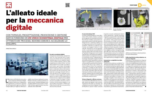 Un unico ecosistema digitale Sviluppato da TopSolid Sas, azienda francese con oltre quarant’ anni di esperienza nel software tecnico-industriale, TopSolid nasce con un obiettivo chiaro: creare una filiera digitale continua, dalla progettazione al pezzo finito. La forza della piattaforma sta nella sua integrazione nativa: ogni modulo, dal disegno alla produzione, utilizza lo stesso database e condivide le stesse informazioni. Non esistono più file da esportare, dati duplicati o passaggi manuali: tutto avviene all’ interno di un ambiente unico, coerente e sempre aggiornato. Questo approccio riduce in modo significativo il rischio di errori, migliora la tracciabilità e velocizza i tempi di sviluppo. L’ intero processo produttivo diventa un flusso continuo di informazioni digitali, in cui ogni modifica al progetto si riflette automaticamente sulle fasi successive fino alla macchina utensile.