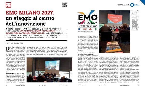 Dopo l’ edizione tedesca, andata in scena lo scorso mese di ottobre ad Hannover, EMO, la mondiale dedicata al mondo della lavorazione dei metalli, tornerà in Italia nel 2027, per organizzazione delle strutture operative di UCIMU- Sistemi per Produrre. L’ appuntamento con EMO MILANO 2027 è fissato dal 4 all’ 8 ottobre presso il quartiere espositivo di fieramilano. L’ annuncio è stato dato, come da tradizione, in occasione della conferenza stampa che l’ Associazione dei costruttori italiani di macchine utensili, robot e automazione organizza nell’ ambito di EMO HANNO- VER.