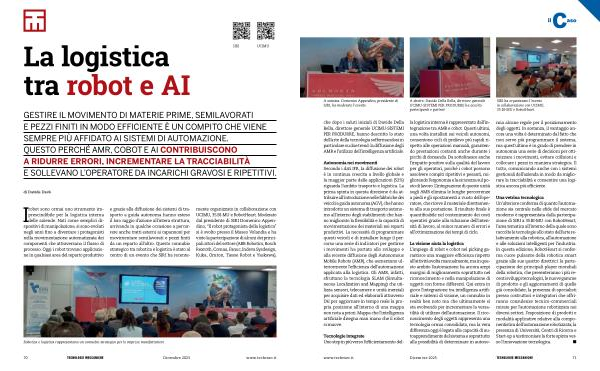 Tecnologie integrate Uno step in più verso l’ efficientamento del- la logistica interna è rappresentato dall’ integrazione tra AMR e cobot. Questi ultimi, una volta installati sui veicoli autonomi, consentono cicli di prelievo più rapidi rispetto alle operazioni manuali, garantendo prestazioni costanti anche durante i picchi di domanda. Da sottolineare anche l’ impatto positivo sulla qualità del lavoro per gli operatori, poiché i cobot possono assolvere compiti ripetitivi e pesanti, migliorando l’ ergonomia e la sicurezza sul posto di lavoro. L’ integrazione di queste unità sugli AMR elimina le lunghe percorrenze a piedi e gli spostamenti a vuoto dell’ operatore, che riceve il materiale direttamente alla sua postazione. Il risultato finale è quantificabile nel contenimento dei costi operativi grazie alla riduzione dell’ intensità di lavoro, al minor numero di errori e all’ ottimizzazione dei tempi di ciclo.