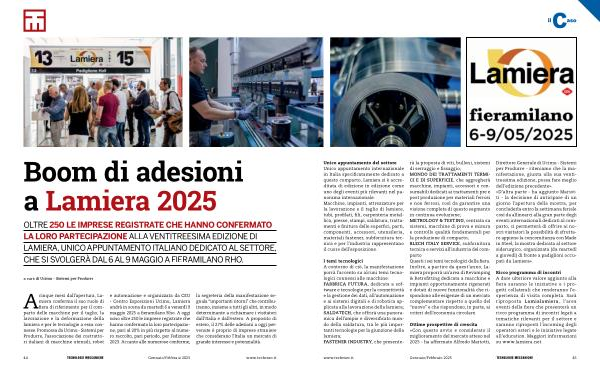 A cinque mesi dall ’ apertura , Lamiera conferma il suo ruolo di fiera di riferimento per il comparto delle macchine per il taglio , la lavorazione e la deformazione della lamiera e per le tecnologie a essa connesse . Promossa da Ucimu - Sistemi per Produrre , l ’ associazione dei costruttori italiani di macchine utensili , robot e automazione e organizzata da CEU - Centro Esposizioni Ucimu , Lamiera andrà in scena da martedì 6 a venerdì 9 maggio 2025 a fieramilano Rho . A oggi sono oltre 250 le imprese registrate che hanno confermato la loro partecipazione , pari al 20 % in più rispetto al numero raccolto , pari periodo , per l ’ edizione 2023 . Accanto alle numerose conferme , la segreteria della manifestazione segnala “ importanti ritorni ” che contribuiranno , insieme a tutti gli altri , in modo determinante a richiamare i visitatori dall ’ Italia e dall ’ estero . A proposito di estero , il 27 % delle adesioni a oggi pervenute è proprio di imprese straniere che considerano l ’ Italia un mercato di grande interesse e potenzialità .