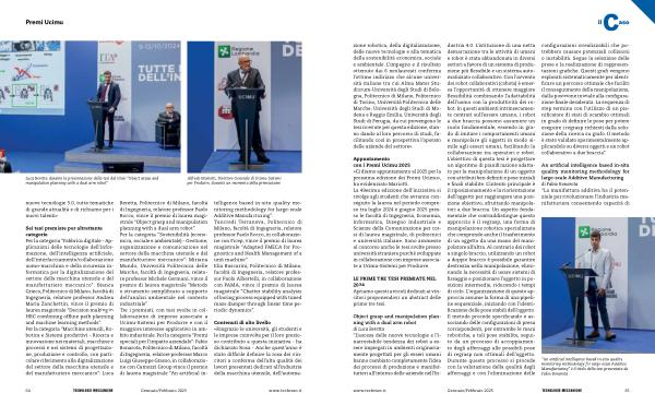 Beretta , Politecnico di Milano , facoltà di Ingegneria , relatore professor Paolo Rocco , vince il premio di laurea magistrale “ Object grasp and manipulation planning with a dual arm robot ”. Per la categoria “ Sostenibilità ( economica , sociale e ambientale ) - Gestione , organizzazione e comunicazione nel settore della macchina utensile e del manifatturiero meccanico ”: Miriana Mundo , Università Politecnica delle Marche , facoltà di Ingegneria , relatore professor Michele Germani , vince il premio di laurea magistrale “ Metodo e strumento semplificato a supporto dell ’ analisi ambientale nel contesto industriale ”. Tre i premiati , con tesi svolte in collaborazione di imprese associate a Ucimu-Sistemi per Produrre e con il maggiore interesse applicativo in ambito industriale . Per la categoria “ Premi speciali per l ’ impatto aziendale ”: Fabio Bonarota , Politecnico di Milano , facoltà di Ingegneria , relatore professor Marco Luigi Giuseppe Grasso , in collaborazione con Camozzi Group vince il premio di laurea magistrale “ An artificial intelligence based in-situ quality monitoring methodology for large-scale Additive Manufacturing ”. Tancredi Terranova , Politecnico di Milano , facoltà di Ingegneria , relatore professor Paolo Rocco , in collaborazione con Ficep , vince il premio di laurea magistrale “ Adapted FMECA for Prognostics and Health Management of a unit machine ”. Elia Buscarini , Politecnico di Milano , facoltà di Ingegneria , relatore professor Paolo Albertelli , in collaborazione con PAMA , vince il premio di laurea magistrale “ Chatter stability analysis of boring process equipped with tuned mass damper through linear time periodic dynamics ”.