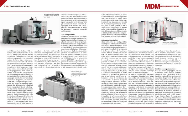 Automazione modulare Altro elemento di configurabilità dell ’ impianto è il magazzino utensili , in quanto è possibile ampliare la capacità del magazzino a giostra principale integrato nella C 62 . La capacità è di 70 posti nel caso di utensili con attacco HSK 63 , mentre per utensili HSK 100 la disponibilità scende a 50 posti . Solitamente la posizione degli utensili è random , ma per utensili speciali come le testine angolari è possibile identificare un posizionamento preciso . L ’ ampliamento dello spazio a magazzino avviene tramite moduli esterni connessi dal lato posteriore della macchina , che scambiano gli utensili con la giostra grazie a un braccio automatizzato . Si tratta di moduli ad arena al cui interno si muove una colonna con braccio telescopico dotato di movimento in Z . Il numero e la distanza tra i piani vengono definiti in funzione della necessità del cliente e della tipologia di utensili allocati . Il cambio dell ’ utensile in macchina viene eseguito direttamente dal mandrino senza sistemi intermedi . Si tratta di una operazione di pick-up : le porte che separano la giostra dalla zona di lavoro si aprono , il mandrino ha un ’ extracorsa in Y che gli permette di collocarsi sopra la giostra , e da quella posizione si abbassa per depositare l ’ utensile equipaggiato e prelevare quello successivo .
